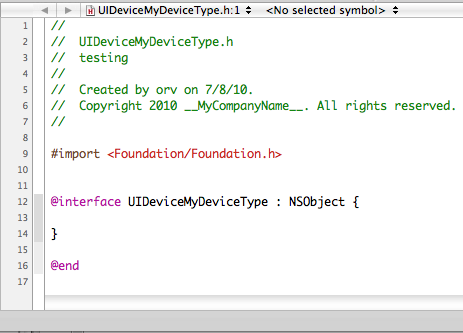 The first thing we will do here is replace the class name UIDeviceMyDeviceType with the class name we are creating a category for. In this case that is UIDevice.